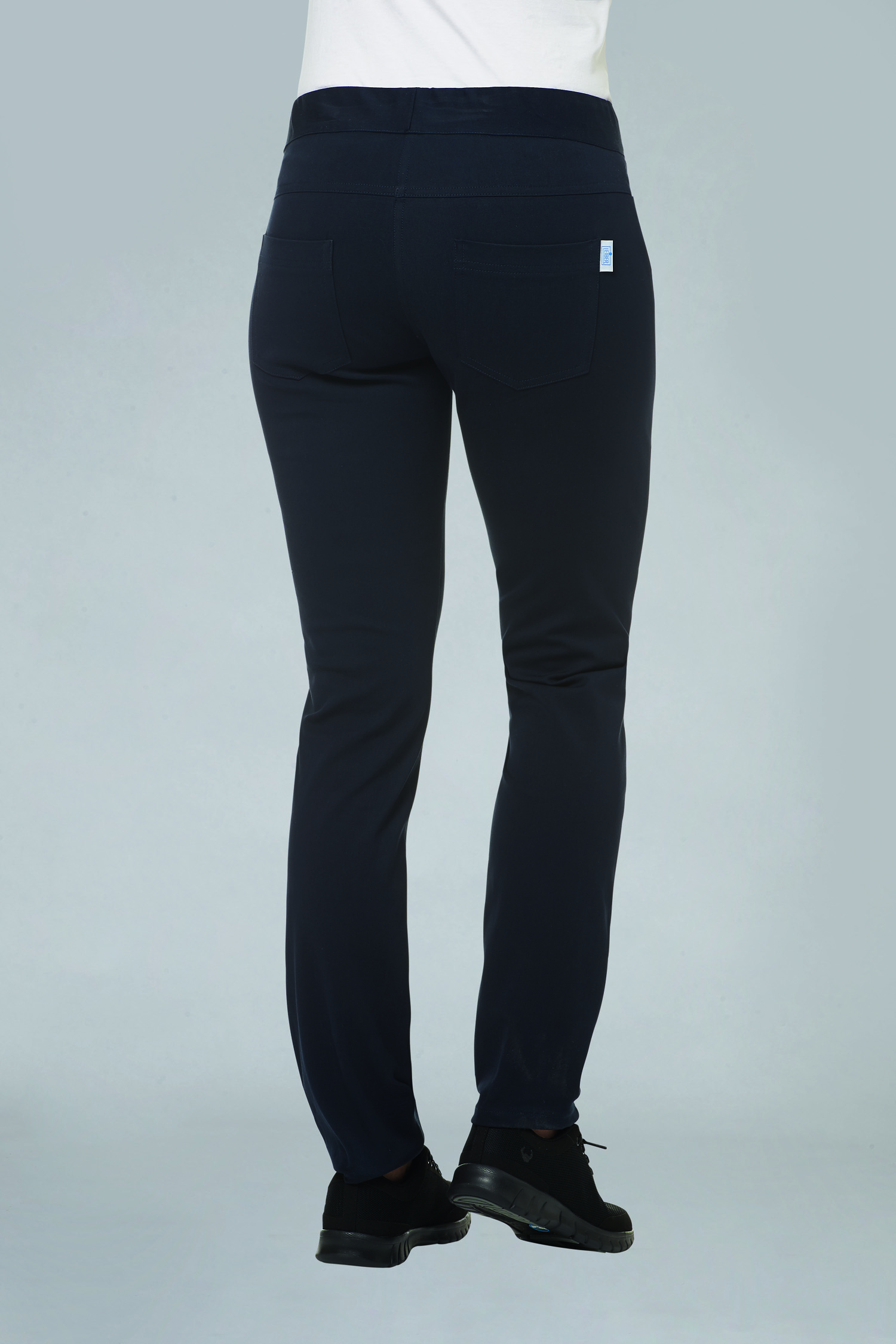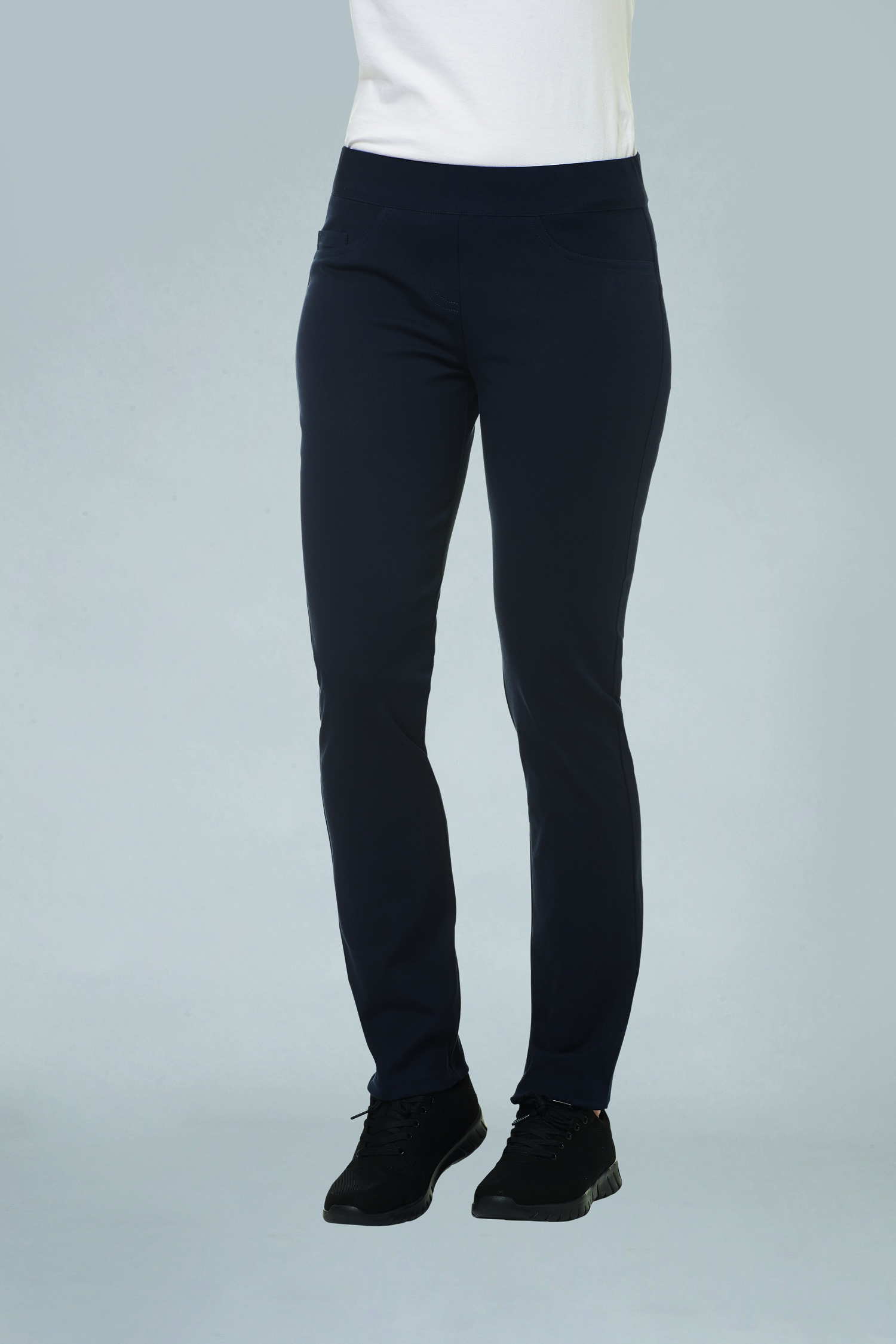 bequeme Damen-Stretchhose aus 73 % Baumwolle, 23 % Polyamid und 5 % Elastolefin, 270 g/m², Regular Fit, schmales Bein, 2 imitierte Seitentaschen, 2 aufgesetzte Gesäßtaschen, Schrittlängen ca. 80 cm, in den Farben schwarz und weiß erhältlich