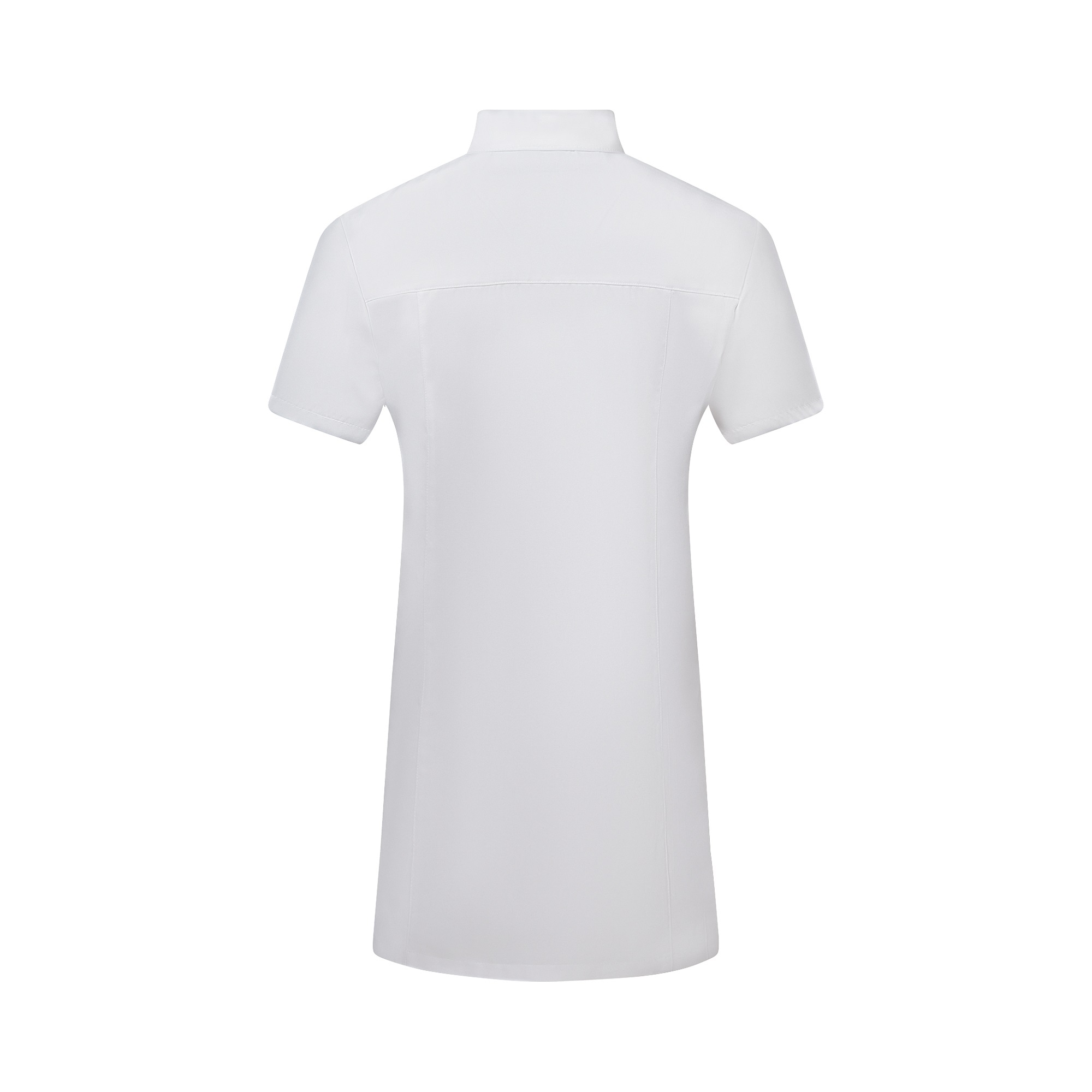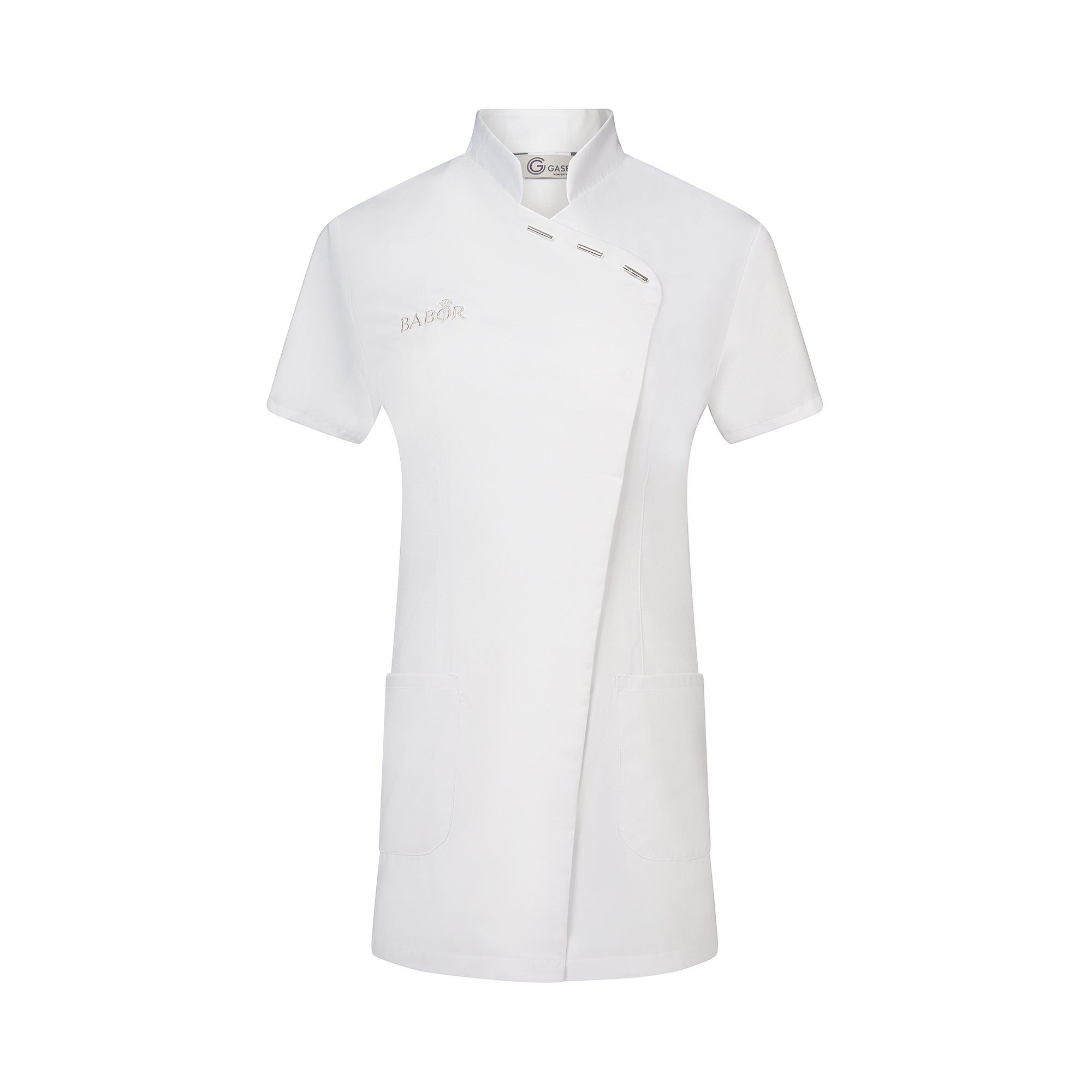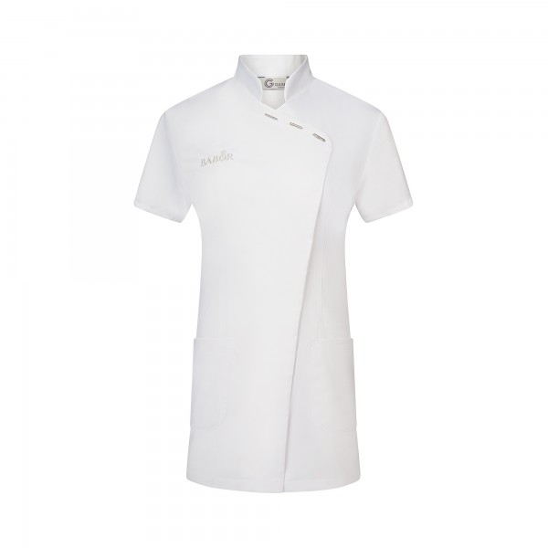 Hergestellt aus einem Cooltex-Light 4/1 Satin-Gewebe in 185 g/m², 50 % Baumwolle / 50 % Polyester. Das Gewebe ist so konstruiert, dass die Innenseite des Gewebes überwiegend aus Baumwolle und die Außenseite aus Polyester besteht. Dadurch wird der Komfort von Baumwolle mit den strapazierfähigen Eigenschaften von Polyester kombiniert.Sehr pflegeleicht; figurbetonender Schnitt, asiatische Optik durch asymmetrische Knopfführung, fest angenähte silberne Metallknöpfe im oberen Bereich sowie verdeckte Druckknöpfe, ½ Arm, Stehkragen, zwei aufgesetzte Seitentaschen, inklusive passender Direkteinstickung des BABOR Markenlogos in silber