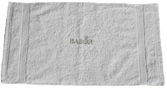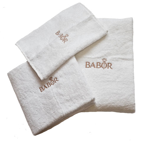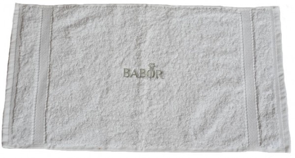 VOSSEN, soft terry towelling made of high quality super soft yarn, quality weight 480 g/m², 100% cotton, color white available in 4 different sizes, 30 x 50 cm | 50 x 100 cm | 67 x 140 cm | 80 x 200 cm, the embroidery of the BABOR brand logo is optionally available in silver gray, ice gold or rose gold as well as neutral without embroidery. The embroidery size has been optimized!