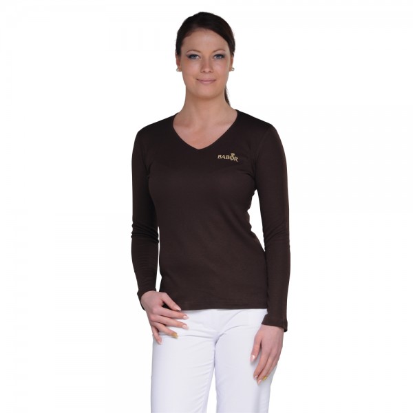 High grade Interlook quality made from 50% cotton/ 50% modal in 185 g/m², elegant and feminine sheen, very soft feel, long sleeve, inclouding embroidery of the BABOR trademark logo in silver grey by the shirts in white, grey and black, in ice-gold by the dark brown shirts, available in size XS - 3XL
