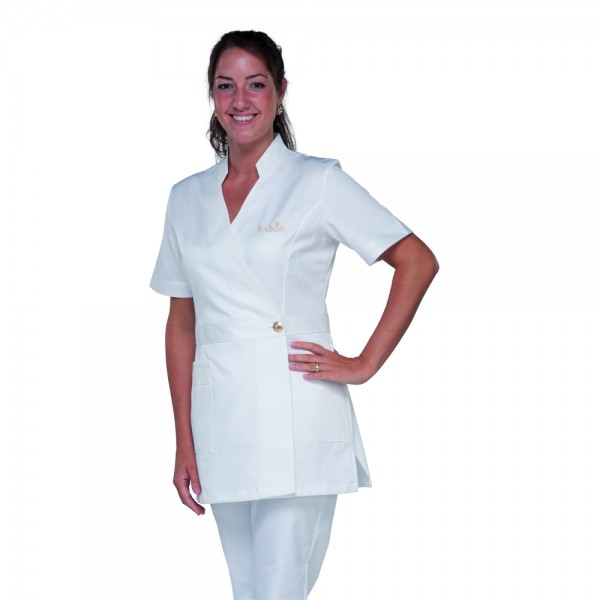 Is made of a premium 2-ply gabardine fabric in 210 g/m² from 100 % cotton, very easy-care, slightly fitted, stand-up collar with v-neck, 2 side pockets, waist band with a stylish metal button, back length approx. 78 cm, inclouding embroidery of the BABOR trademark logo in ice-gold