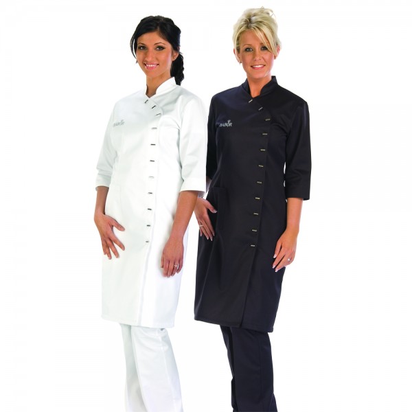 Premium 2-ply gabardine fabric in 210 g/m² made from 100% cotton, very easy-care, figure enhancing cut, Asian look due to the asymmetrical button placement, tightly-sewn metal buttons, ¾ sleeve, stand-up collar, side pocket on the right side, back comfort pleat, you can also select different buttons with the appropriate embroidery color of the BABOR trademark logo