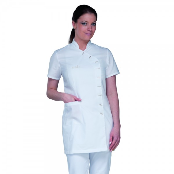 made of 50 % cotton / 50 % polyester, 180 g/m²; figure enhancing cut (please have a look to finished measurement), Asian look due to the asymmetrical button placement, short sleeve, stand-up collar, side pocket on the right side, back with comfort pleat, you can also select different buttons with the appropriate embroidery color of the BABOR trademark logo