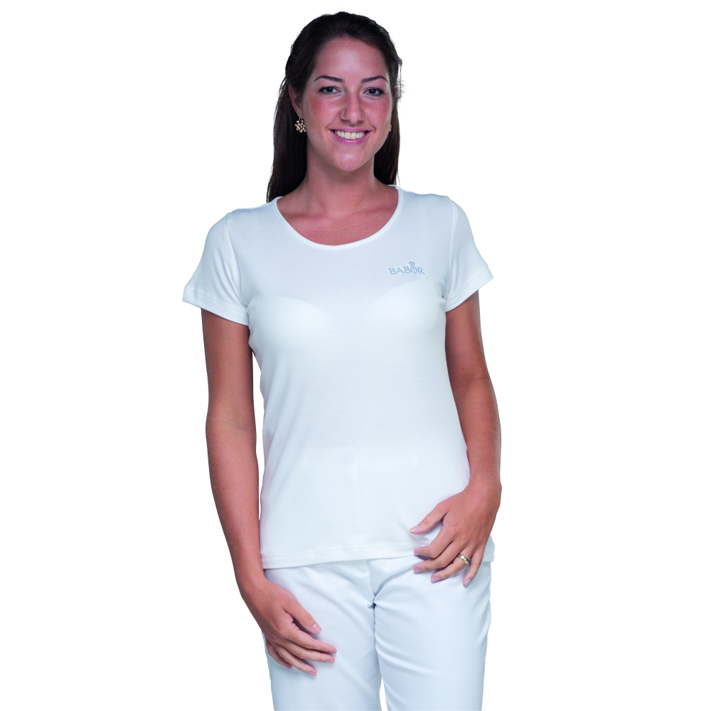 Hochwertige Interlook Qualität aus 50% Baumwolle / 50% Modal in 185 g/m²; edler und femininer Glanz, sehr weicher Griff, Kurzarm; inkl. Stick des Markenlogos BABOR, standardmäßig in silbergrau bei den weißen, grauen und schwarzen T-Shirts, sowie in icegold bei den braunen T-Shirts; Das T-Shirt ist in den Größen XS-3XL erhältlich (Produkte in der Größe 3XL werden mit einem Aufschlag von 5% berechnet)